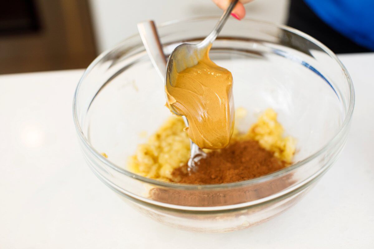 - Mash banana in a medium bowl and add in cocoa powder, peanut butter, flax, protein powder and a pinch of sea salt.