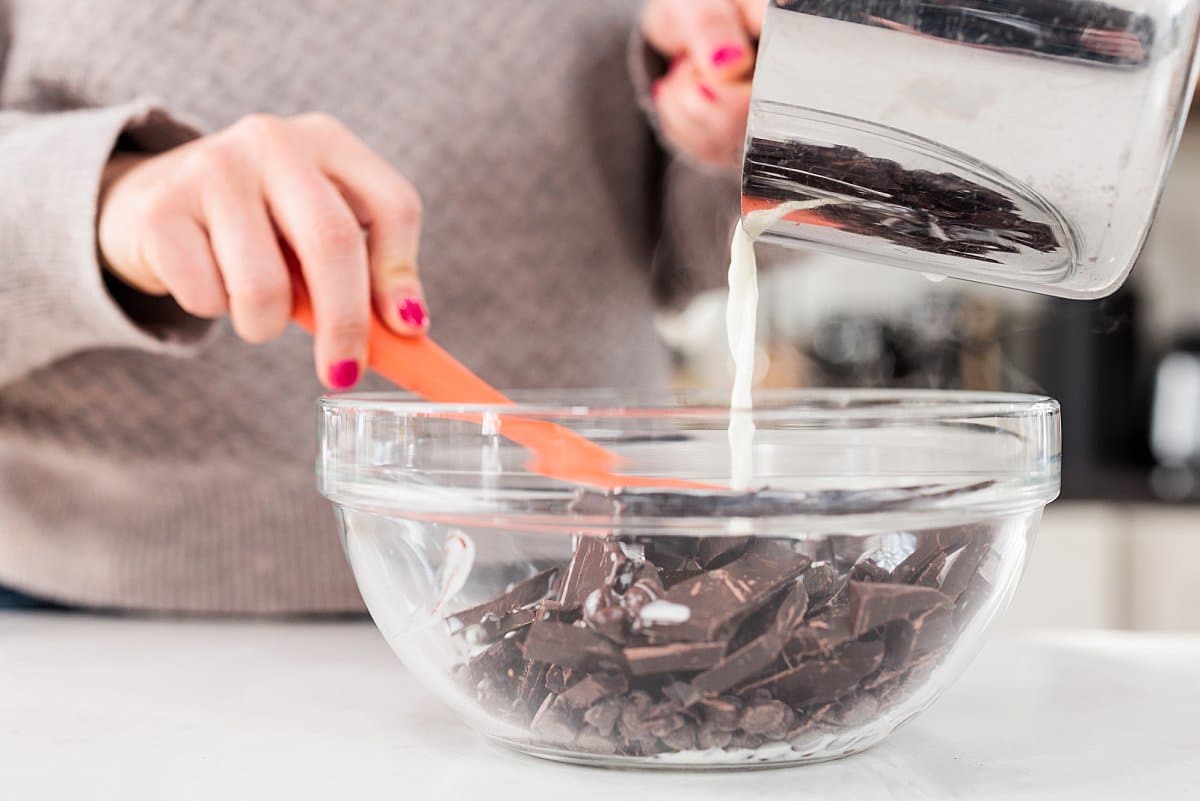 Right as the cream starts to bubble, remove it from heat and pour slowly over the chocolate. Stir gradually until all cream has been added, and all of the chocolate is melted.