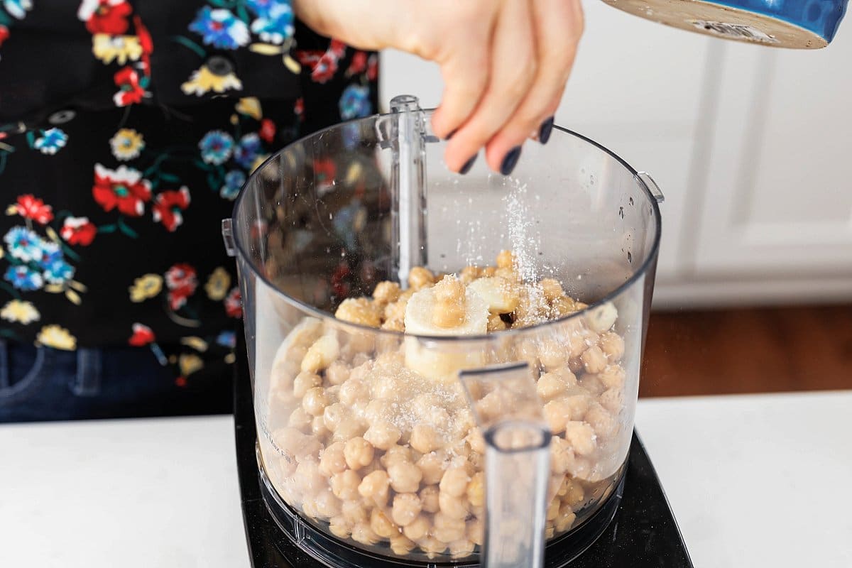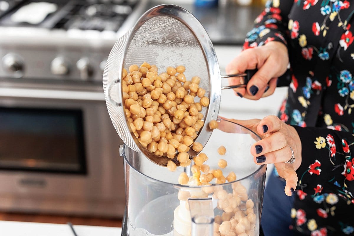 Start your Lebanese Hummus with Toasted Pine Nuts by draining and rinsing your chickpeas.