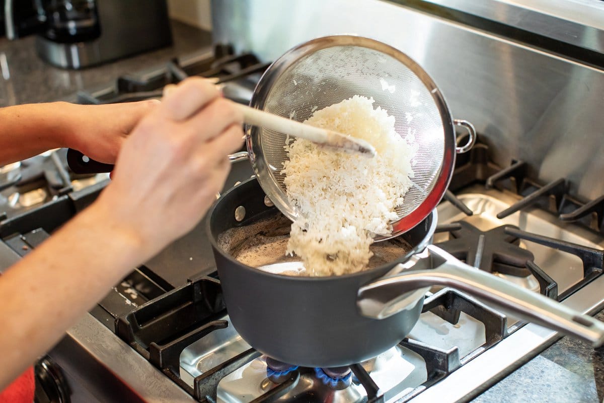 - Meanwhile, place rice in a mesh strainer and rinse until water comes out clear – about 2 minutes.