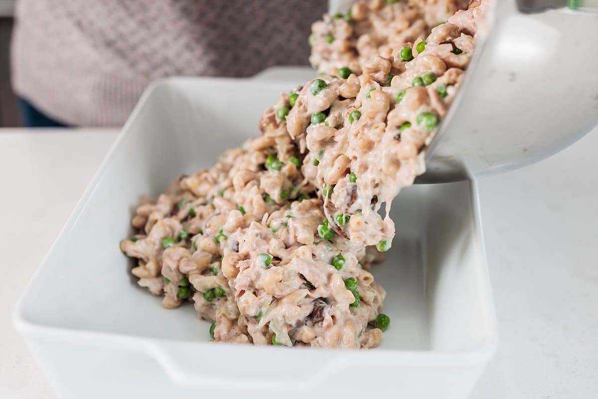 Pour the tuna mixture into a casserole dish and spread evenly.