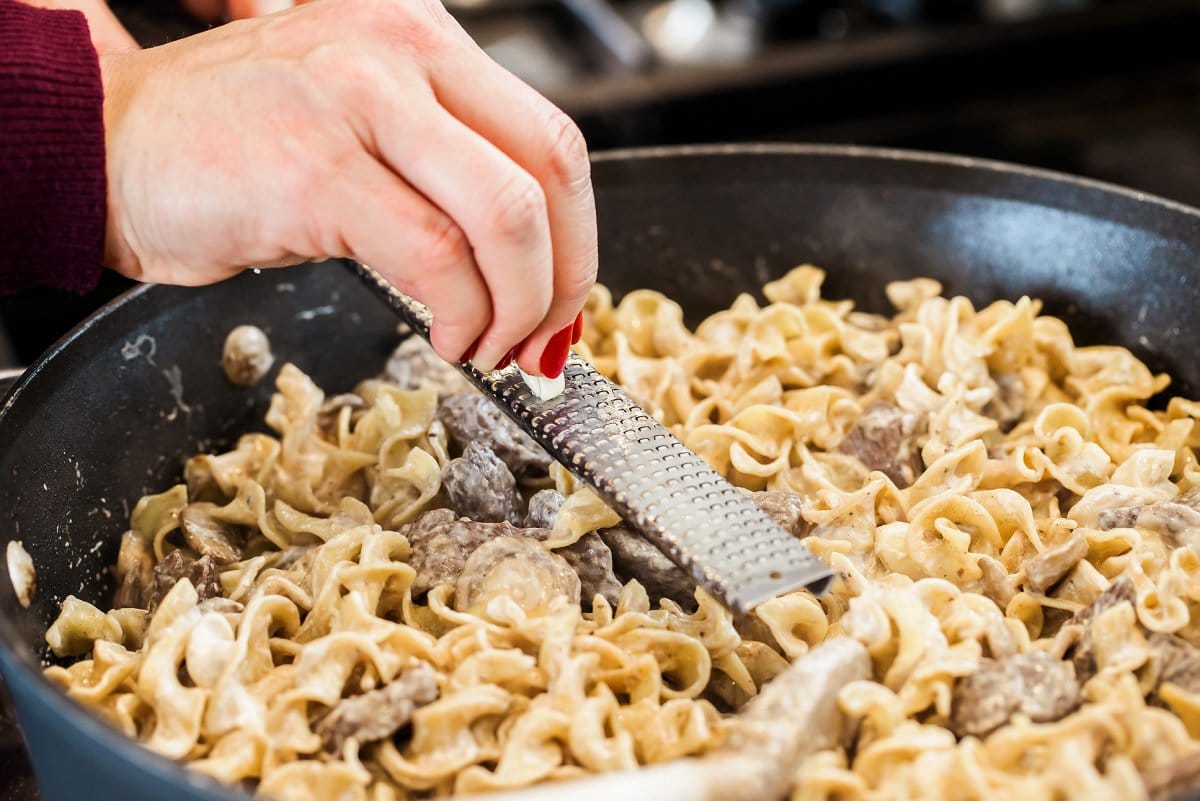 Meanwhile, you’ll cook the noodles according to package instructions then add them into the pan along with the reserved beef and creamy yogurt.