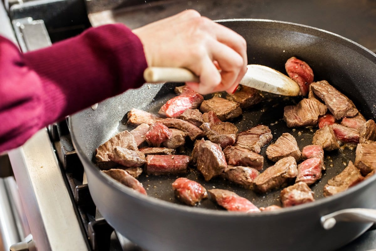 - Heat a deep skillet over medium-high heat and drizzle with olive oil. Sprinkle beef with salt and pepper then saute in the pan until a slight crusts forms, about 2-3 minutes per side. Remove beef from pan and set aside.