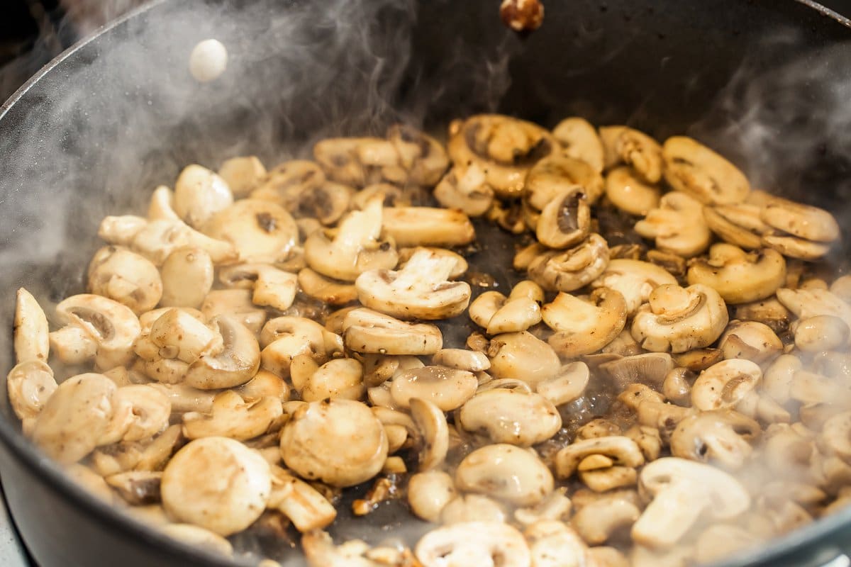 Next, saute the mushrooms in the same pan along with thyme and Worcestershire sauce before sprinkling with a little flour. This flour will allow the sauce to thicken later.