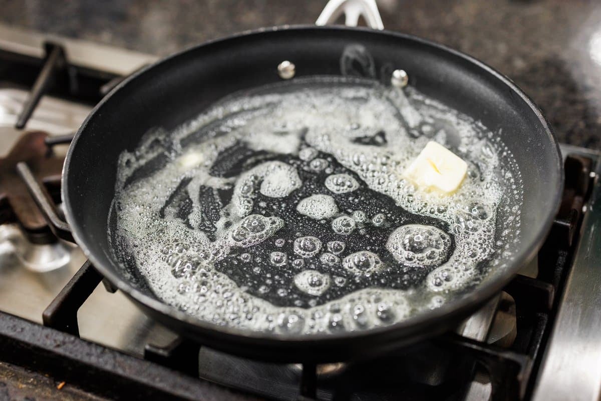 Then heat a skillet over medium heat and melt the butter. Cast-iron skillets work great, but as long as it’s an oven safe pan, you’re good to go!