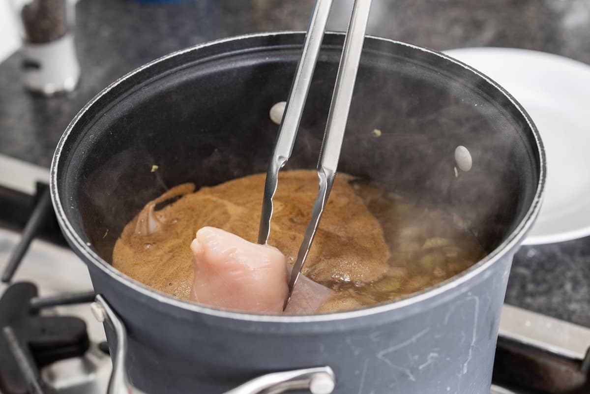 - Add raw, whole chicken breasts and bring to a simmer. Cook for 10-12 minutes at a low boil. Take one chicken breast out and cut in half to check for doneness. (Will take more or less depending on the thickness of chicken.) When chicken is cooked through, remove and place on a cutting board to cool.