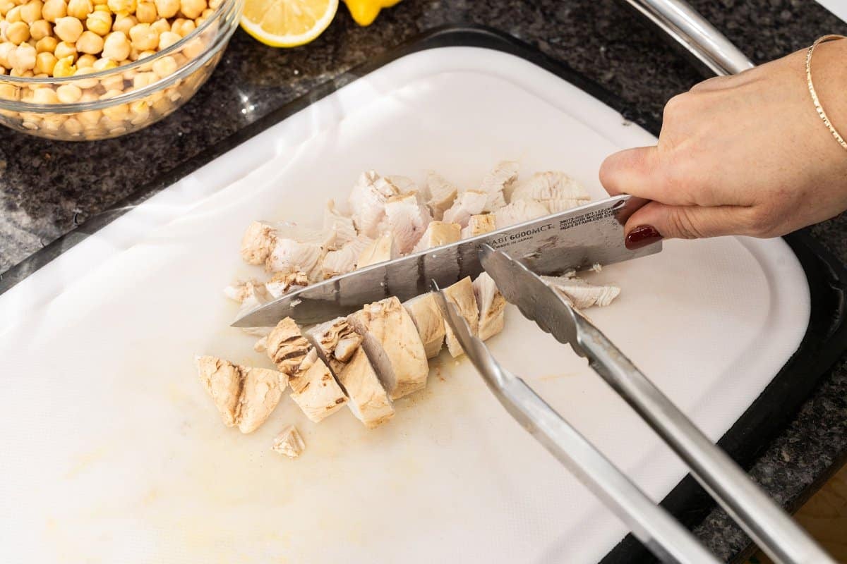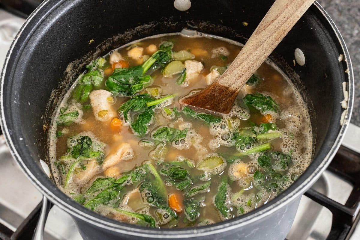 - Begin shreddiing the chicken when it is cool enough to handle. Add shredded chicken back into the broth and veggies. Stir in spinach, chick peas and lemon juice. Cook until spinach is tender, about 5 additional minutes.