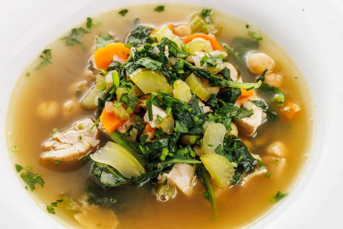 Have you ever tasted a dish that feels like a hug? My easy chicken soup with greens is literally a warm bowl of comfort. Whether you’re coming down with a cold or looking to cheer up a friend, this soup always seems to do the trick. Loaded with nutrients and plenty of lean protein, soups such as this or my Lamb Vegetable Soup are one of my favorite meals-in-a-bowl. One of the reasons I make soups regularly is because they are perfect for using up any leftover produce I have sitting in the fridge. This particular chicken soup is a wink and a nudge to my Syrian heritage. Made with cinnamon, lemon, garlic and chickpeas, this chicken soup is naturally gluten-free because there are no noodles!