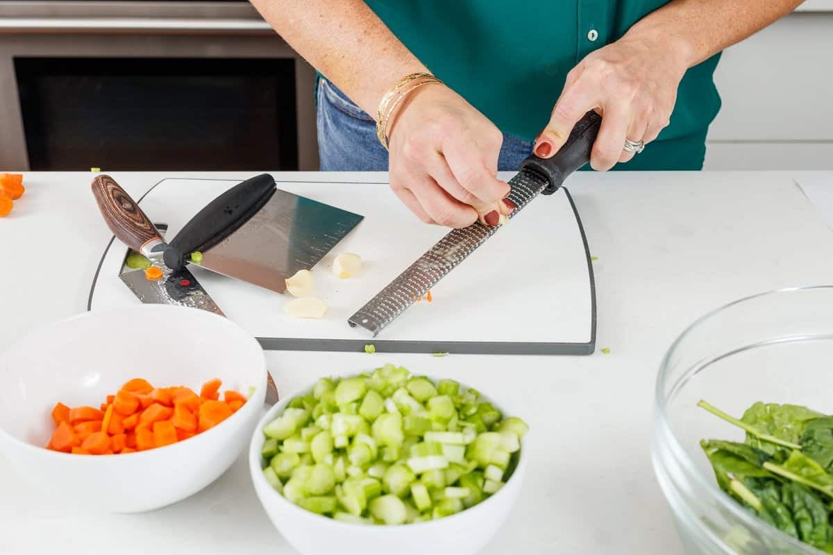 Making this Chicken Soup with Greens is very easy. To start, begin chopping your mirepoix of celery, onions, and carrots.