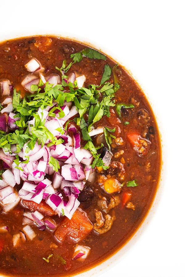 Of course, the best part of chili is garnishing with all of your favorite mix-ins! Cilantro, red onion, jalapeno, shredded cheese, sour cream, the options are limitless.