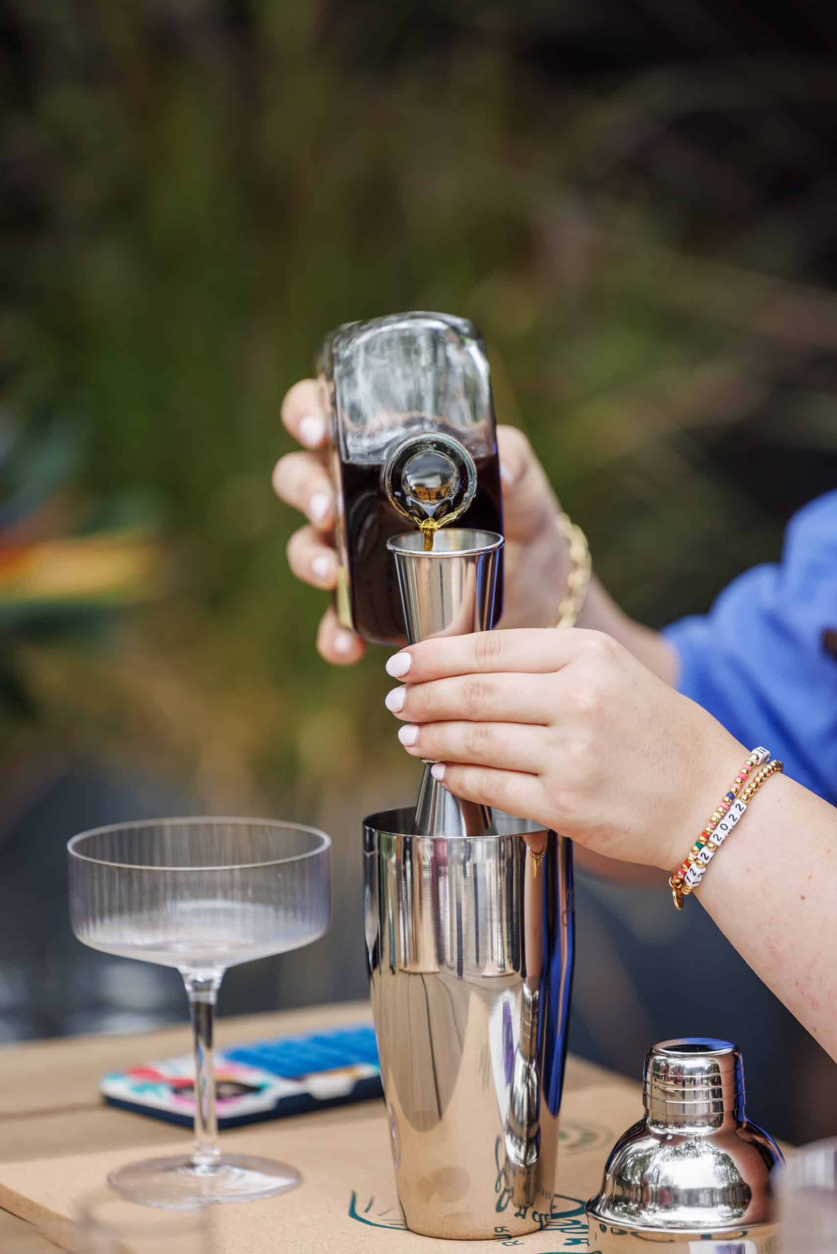 Next you’ll add the coffee liquor and chilled espresso. Finish with the simple syrup and top with the lid.