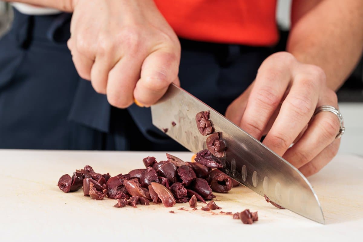 While farro is cooking, mince your olives, red onion, and dill.