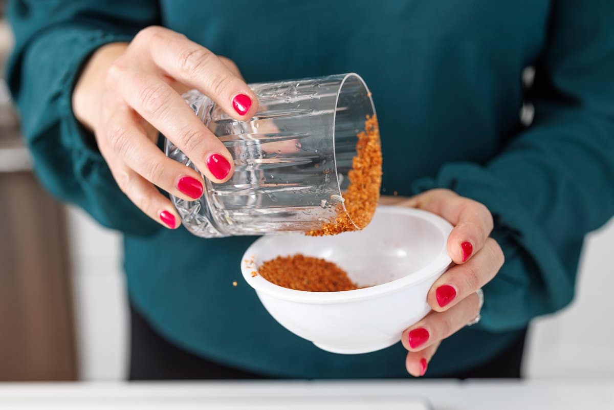 Then take your glasses and run a lime wedge over the rims, then dip into the chili lime salt to create your salt rim.