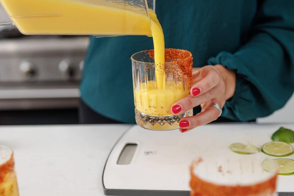 Sweet and tangy frozen mango margaritas are served with a chili-lime salt-rimmed glass for a spicy kick. Every sip is sweet, sour, spicy and salty!
