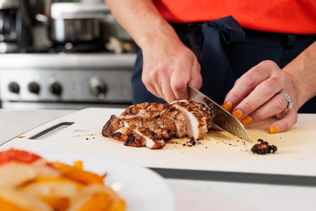 After letting the chicken rest, cut the chicken into strips.