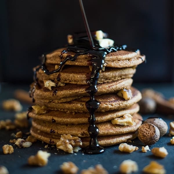 These hearty buckwheat pancakes are lightly sweetened with molasses and scented with warm gingerbread spices like cinnamon, cloves and ginger.