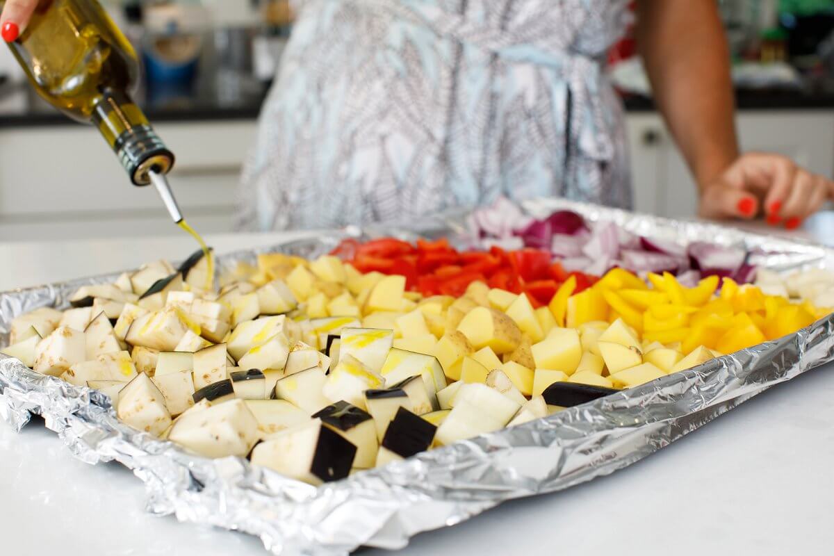 Then you’ll chop your eggplant, onion, and bell peppers to all be roughly the same size as the potatoes. The more uniform in size, the more even they’ll cook!