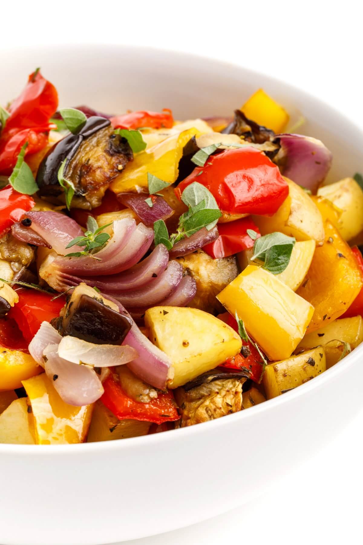 This quick and easy vegetarian side dish recipe is made with various veggies that are baked until caramelized in olive oil and fresh herbs.