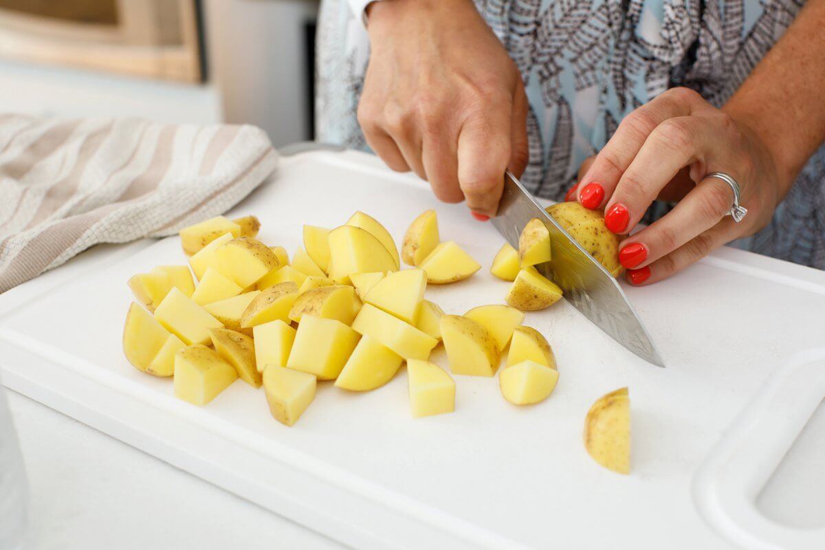 Start your Greek roasted vegetables by washing all your vegetables. Then cut your potatoes. I personally don’t peel mine, but you could if you prefer to!