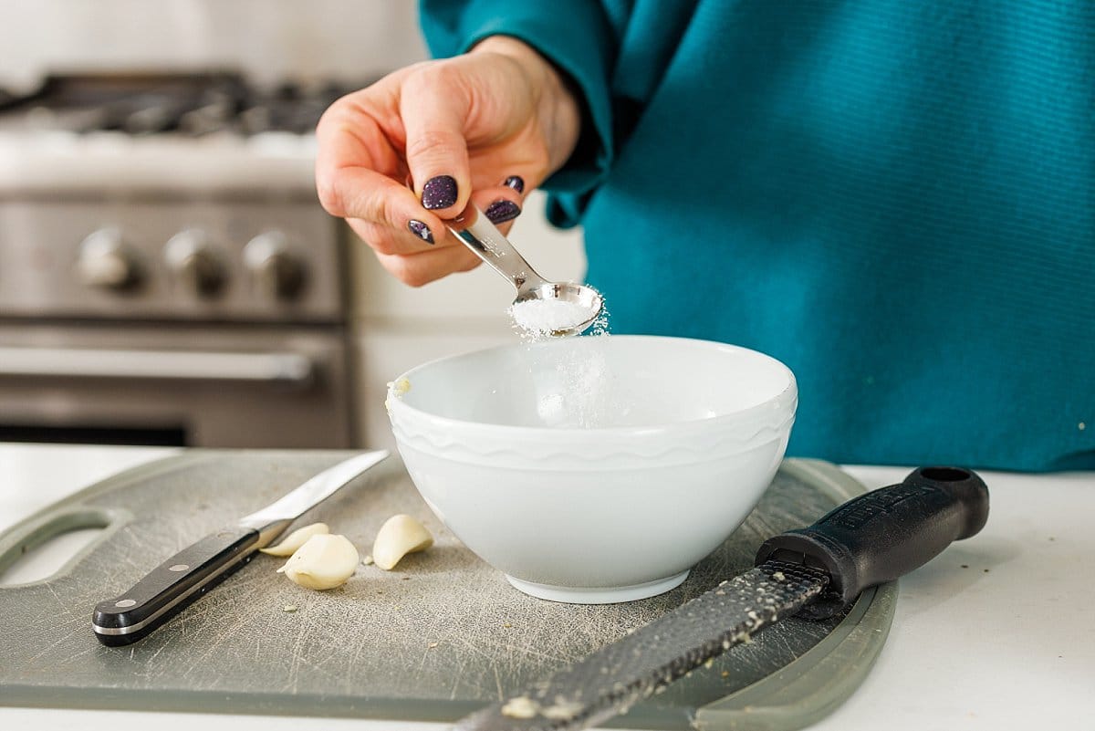 Start your Greek Style Baked Chicken Breasts by making your spice mixture. Freshly grate some garlic into a small bowl.