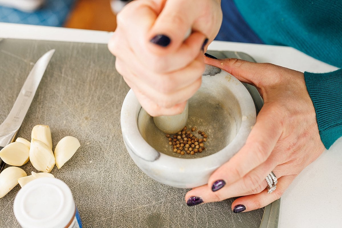 Using a mortar and pestle, freshly grind your coriander. Or, you can use already ground coriander, but freshly ground packs a little extra punch.
