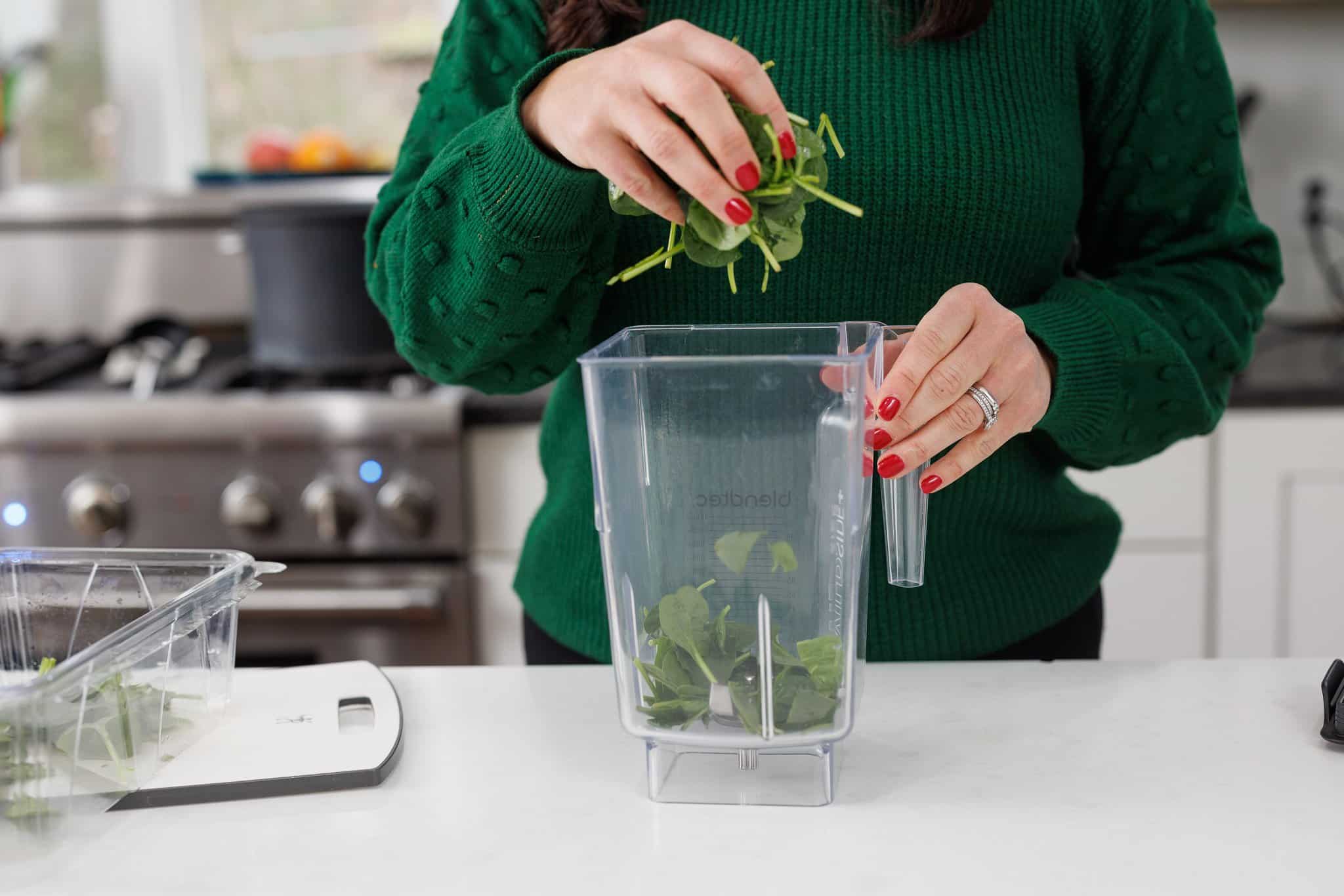 Then take the pitcher of your blender, and put your baby spinach in the bottom.