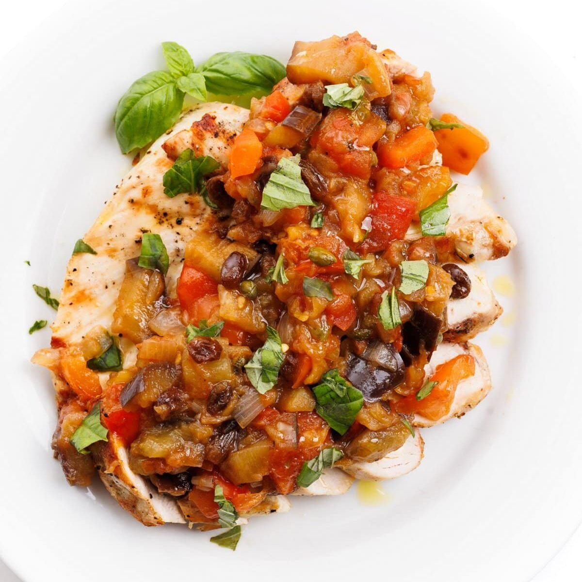 Serve the grilled chicken topped with the eggplant caponata and fresh basil or parsley. Enjoy!