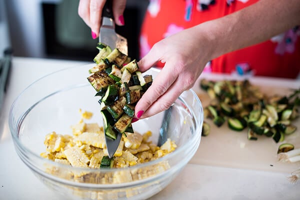 - Remove the veggies from the grill. Uesing a sharp knife, slice the corn into a large bowl. Next, slice the zucchini into bite-sized pieces and add to the bowl. Add all remaining ingredients to the bowl including feta, basil, scallions, lemon juice and remaining 2 tablespoons olive oil. Toss well and season with salt and pepper to taste before serving.