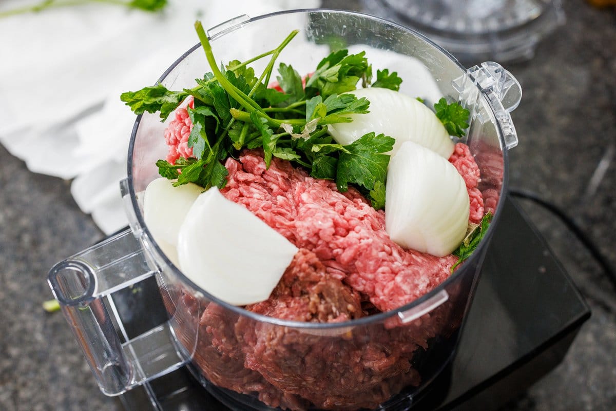 Start your Grilled Lebanese Beef Kafta Patties by putting your ground beef in a large food processor.