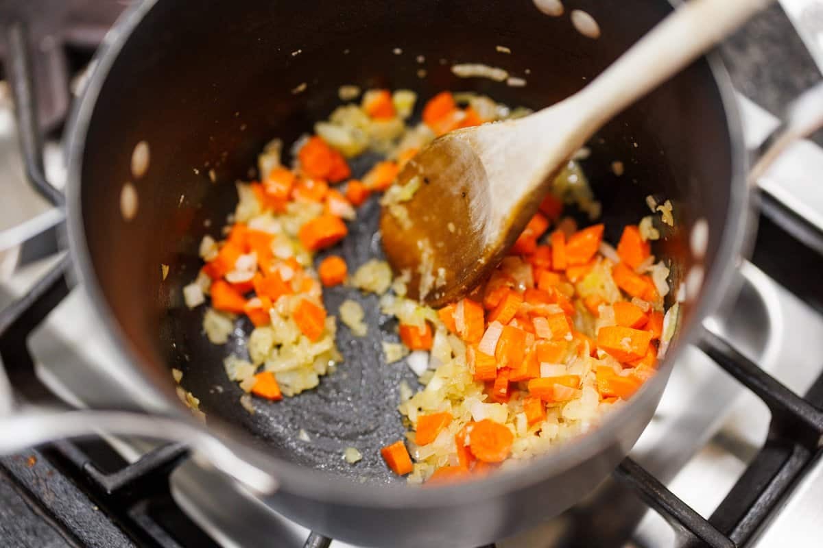 - Heat a deep skillet over medium high heat and add olive oil. Saute onions, garlic and a pinch of salt and pepper, until onions are translucent, about 6-7 minutes. Add carrots and saute additional 5-6 minutes or until softened.