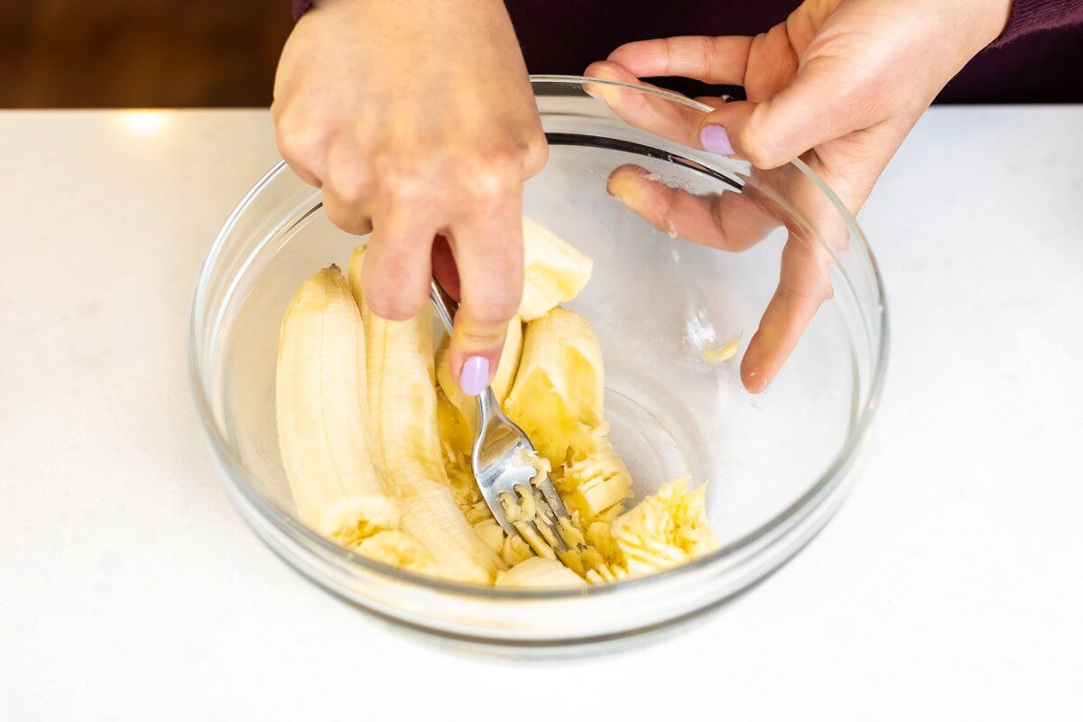 - Reduce stand mixer speed to low and slowly add the eggs one at a time followed by the vanilla, mashed bananas, and yogurt. Use a rubber spatula to scrape down sides and increase speed to medium until ingredients are blended.