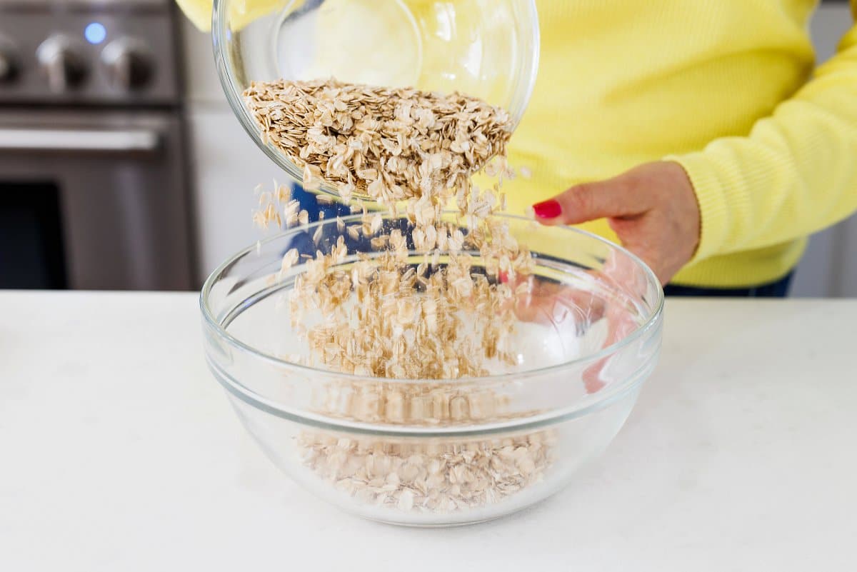 Start your High Protein Homemade Granola by adding oats to a large bowl.