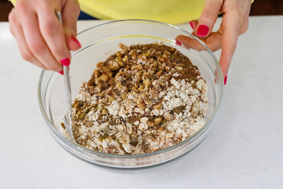- Preheat oven to 325 degrees. In a large bowl, mix together oats, walnuts, pumpkin seeds, flax, protein powder, cinnamon, and salt. Drizzle in honey and olive oil then stir well to evenly coat mixture.2 cups oats, 1 cup walnuts, 1/2 cup pumpkin seeds, 1/2 cup flax seed meal, 1/2 cup protein powder, 2 teaspoons cinnamon, 1/2 teaspoon salt, 1/3 cup honey, 1/3 cup extra virgin olive oil