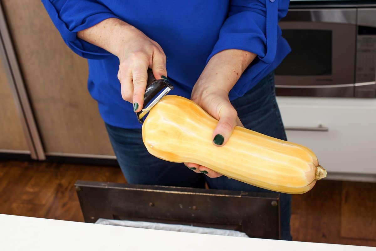 Using a large knife, slice the bottom and top ends off before using a sharp vegetable peeler to remove the skin. Some people will put the squash in the microwave for a few minutes to make the skin softer and easier to peel.