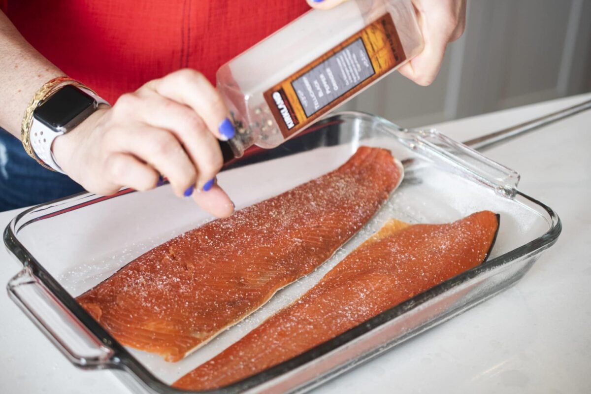 Start by putting your salmon filets skin side down in a large glass baking dish sprayed with cooking oil, and season with salt and pepper.