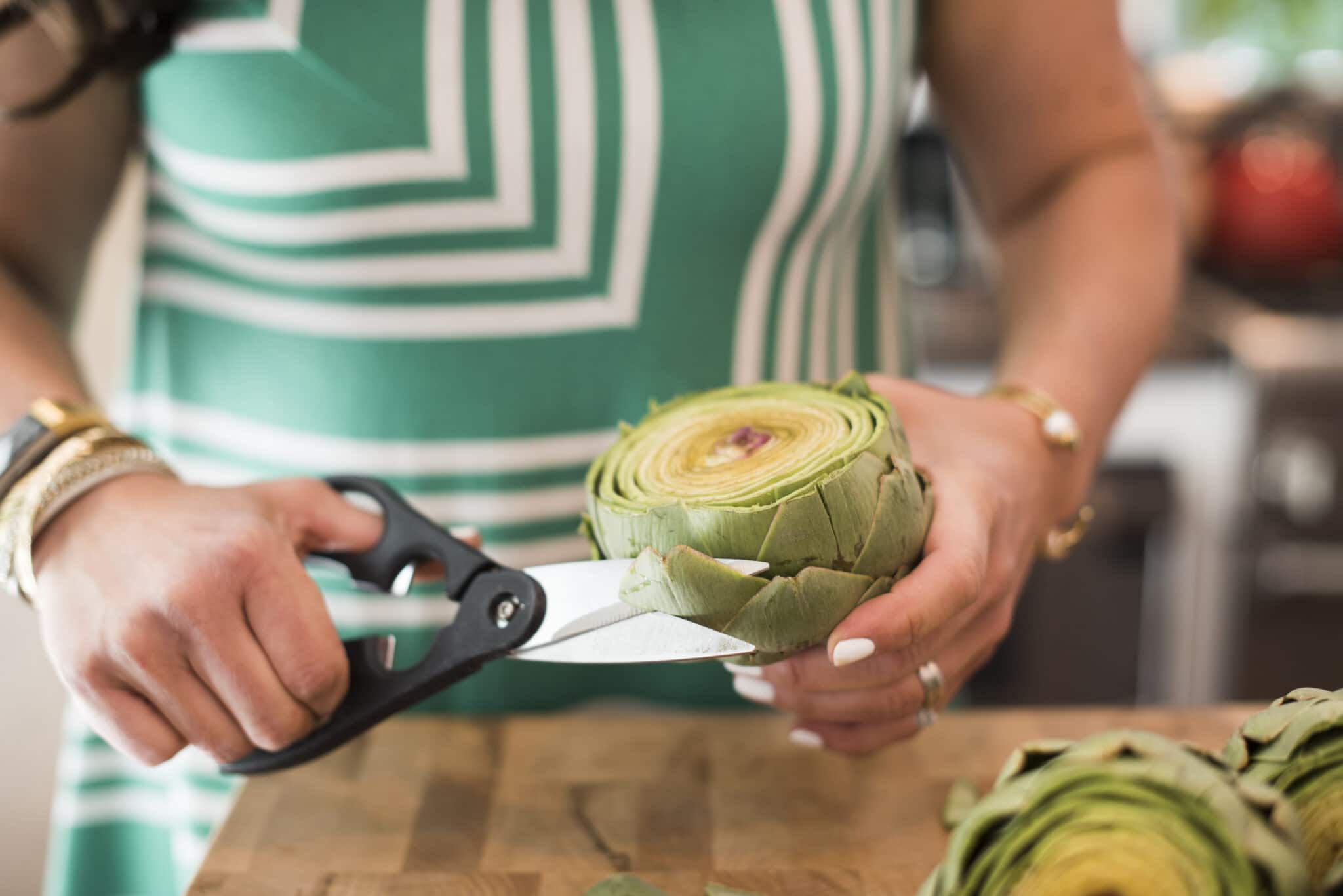 - Grab a pair of scissors for the third step and carefully slice off the pointy tops of each remaining leaf on the outer edge of the artichoke. Be sure to carefully rotate the artichoke in a circle to make sure you don’t have any prickly pieces remaining.
