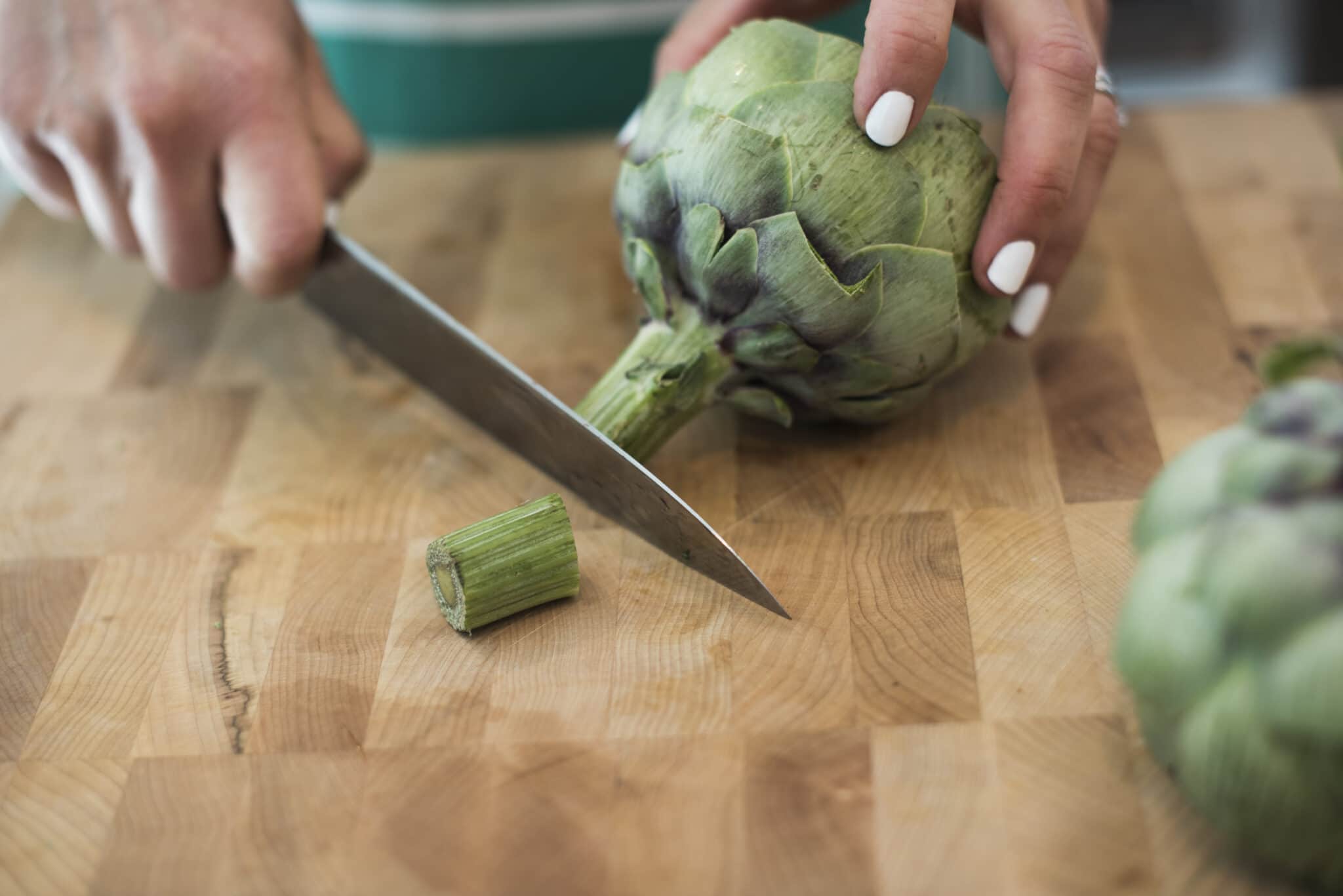 First you’ll cut the tops off of your artichokes, about 1 inch down. None of the meat is on this part, so go ahead and toss them.
