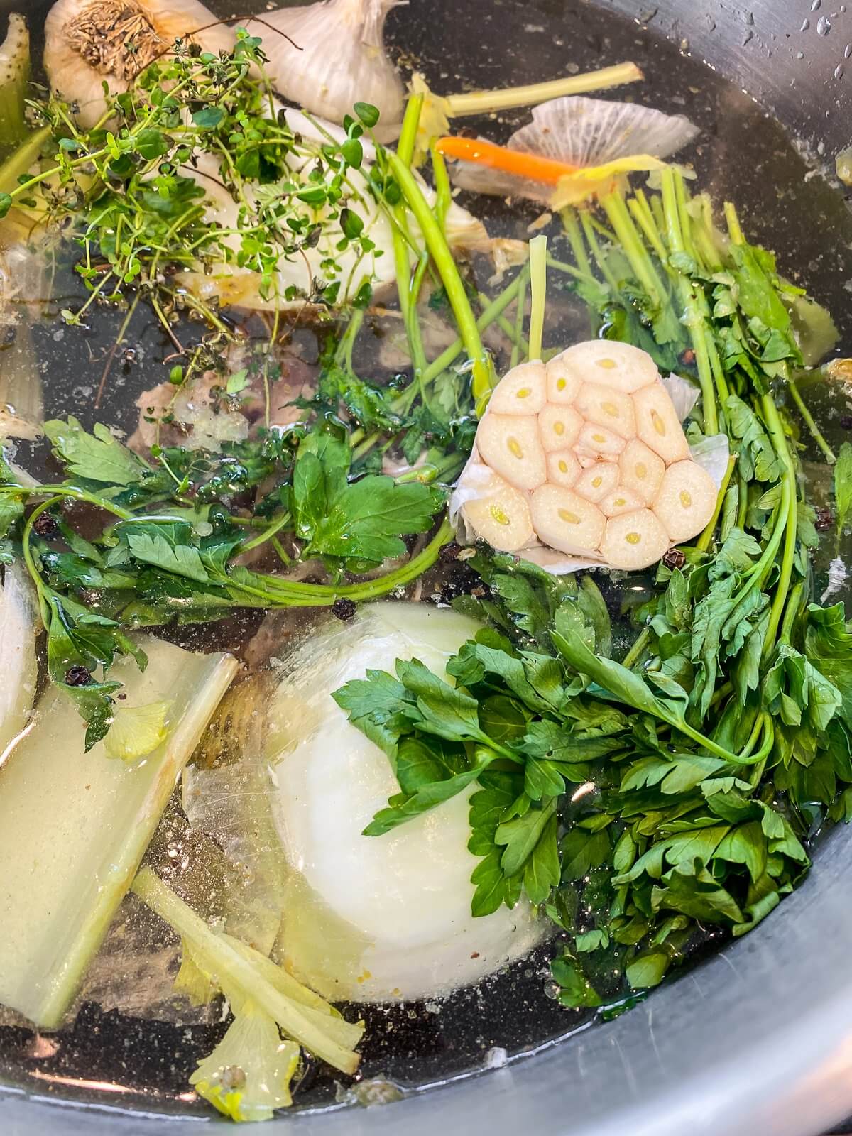 For aromatics, use whatever you have on hand such as parsley, dill, thyme, or even cilantro. Other great options include fresh ginger, lemon peel, and fennel bulb.