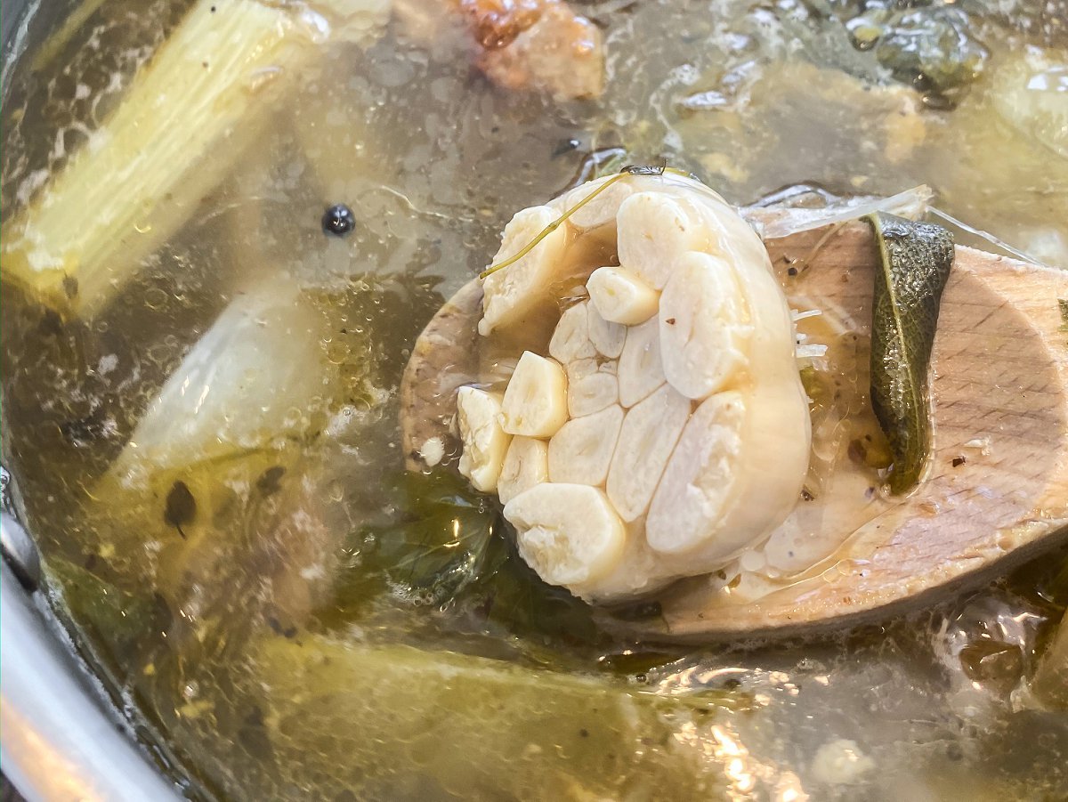 - Place all ingredients in a large stockpot and cover with cold water. Bring pot to a boil then reduce heat to a low simmer.