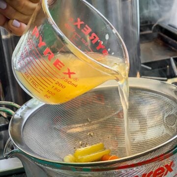 This is the easiest way to separate the beautiful, golden chicken stock from the chicken, bones, veggies and more.