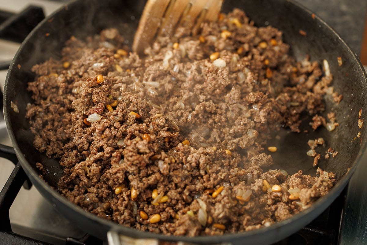 - Begin by cooking the Lebanese Hashweh – Ground Beef with Pine Nuts by following this recipe; set aside.