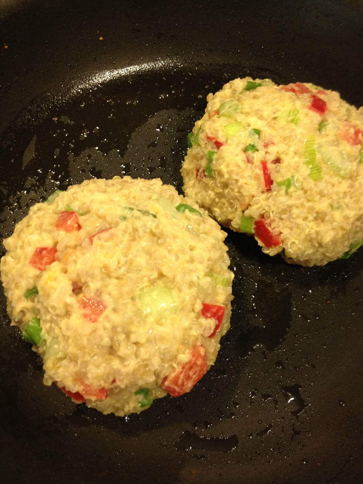 - Form quinoa mixture into palm-sized patties and brown in pan, working in batches, about 3-4 minutes per side. Be careful not to overcrowd the pan.