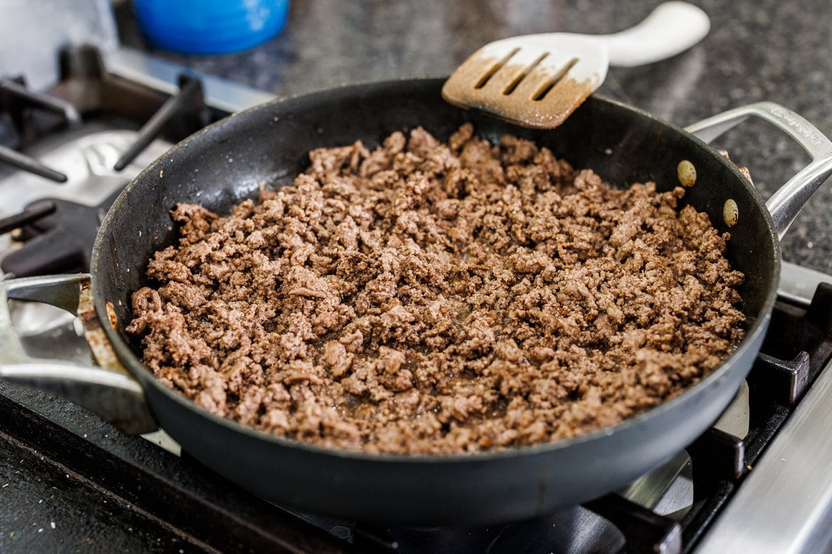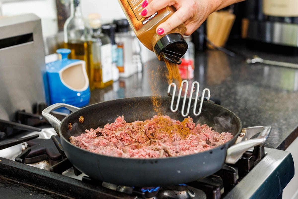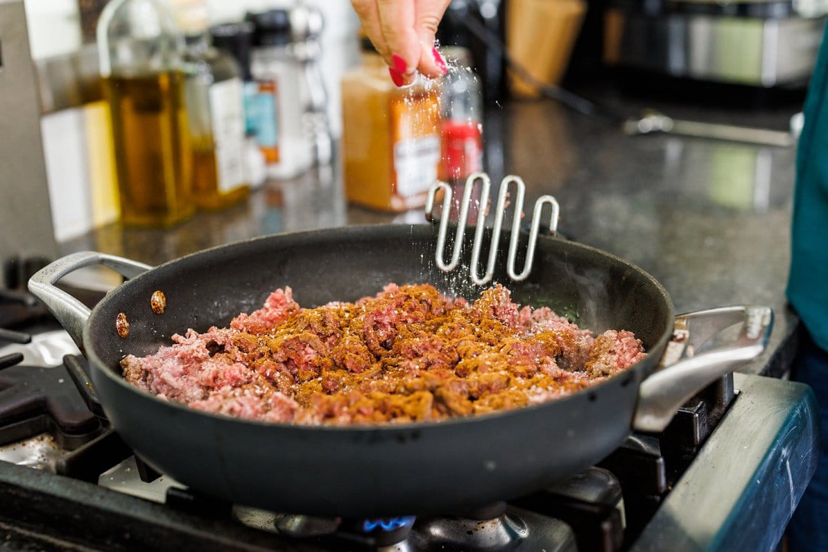 Then add the Certified Angus Beef® ground sirloin to the pan, make sure you break it up as it cooks.