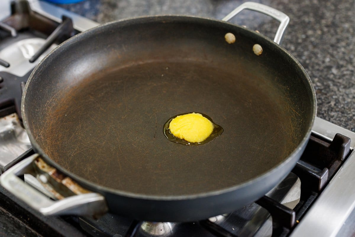 Then in a hot skillet, melt the clarified butter (ghee) over medium/high heat.