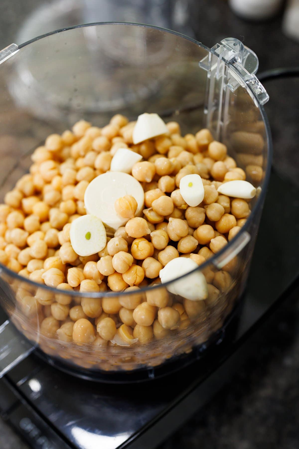 Start your Hummus with Ground Beef by making your hummus. Add your rinsed chickpeas, garlic cloves, and salt to your food processor.