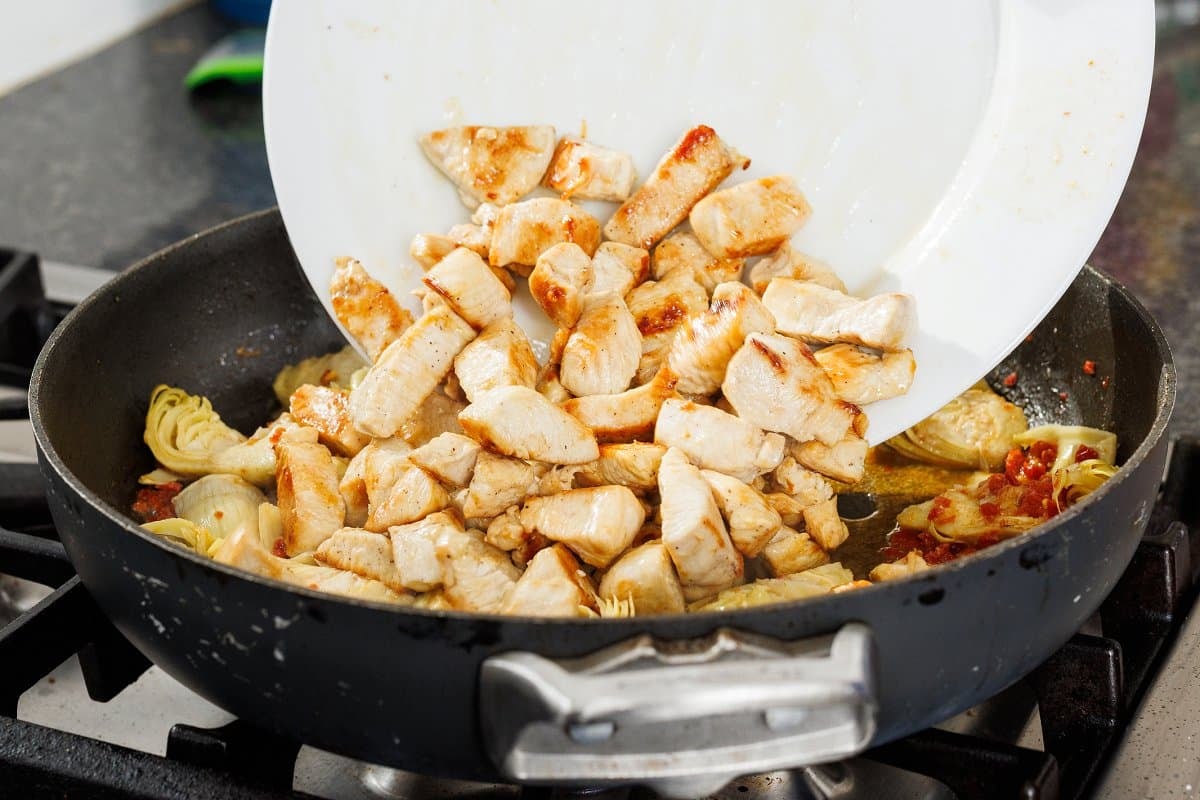 - Add the white wine to the hot pan to deglaze, using a wooden spoon to scrape up all the browned bits. Add the garlic to the pan and heat until fragrant, about 30 seconds, before stirring in the artichoke hearts, sun-dried tomatoes and reserved chicken cubes.