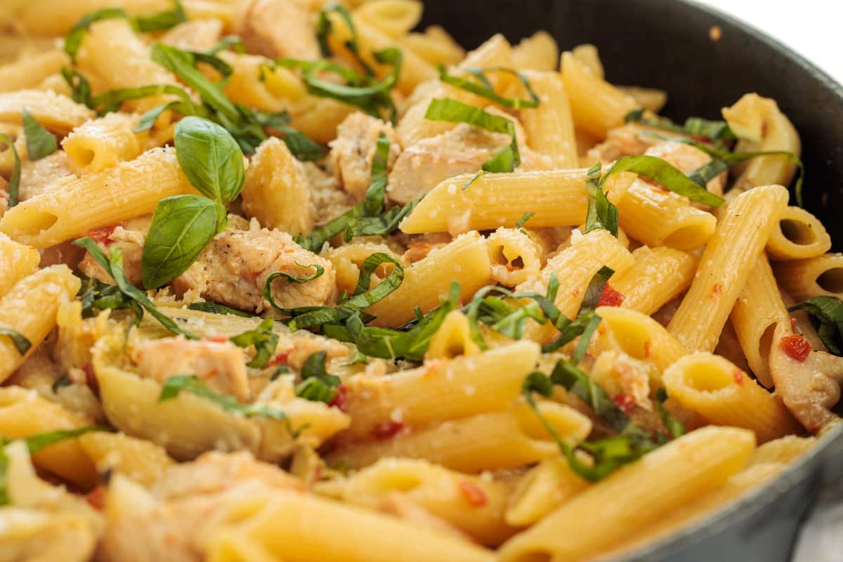 This easy and delicious Italian chicken pasta recipe is filled with large chunks of chicken, tender artichoke hearts, and sun-dried tomatoes.