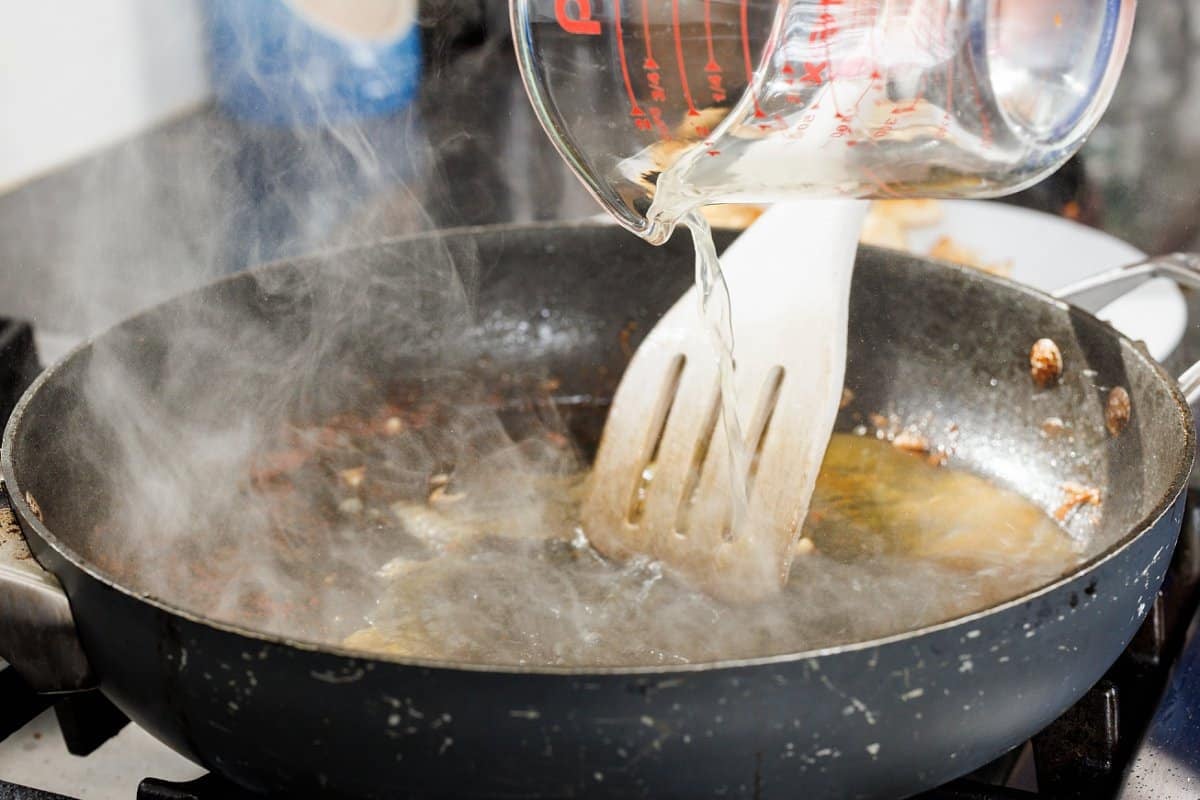 Remove the chicken and use the white wine or chicken broth to deglaze the pan, using a wooden spoon to scrape up any bits stuck on the bottom.
