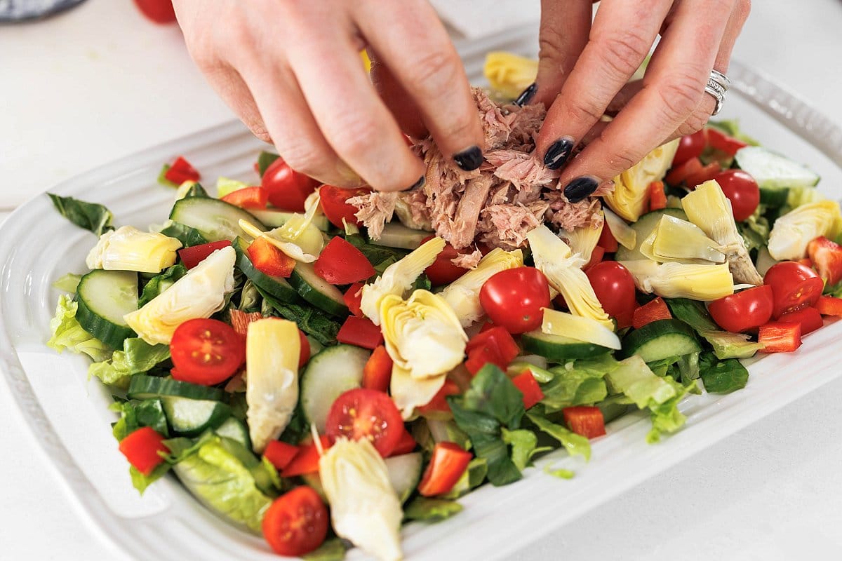Then you’ll add the cherry tomatoes, artichoke hearts, and the canned tuna fish.