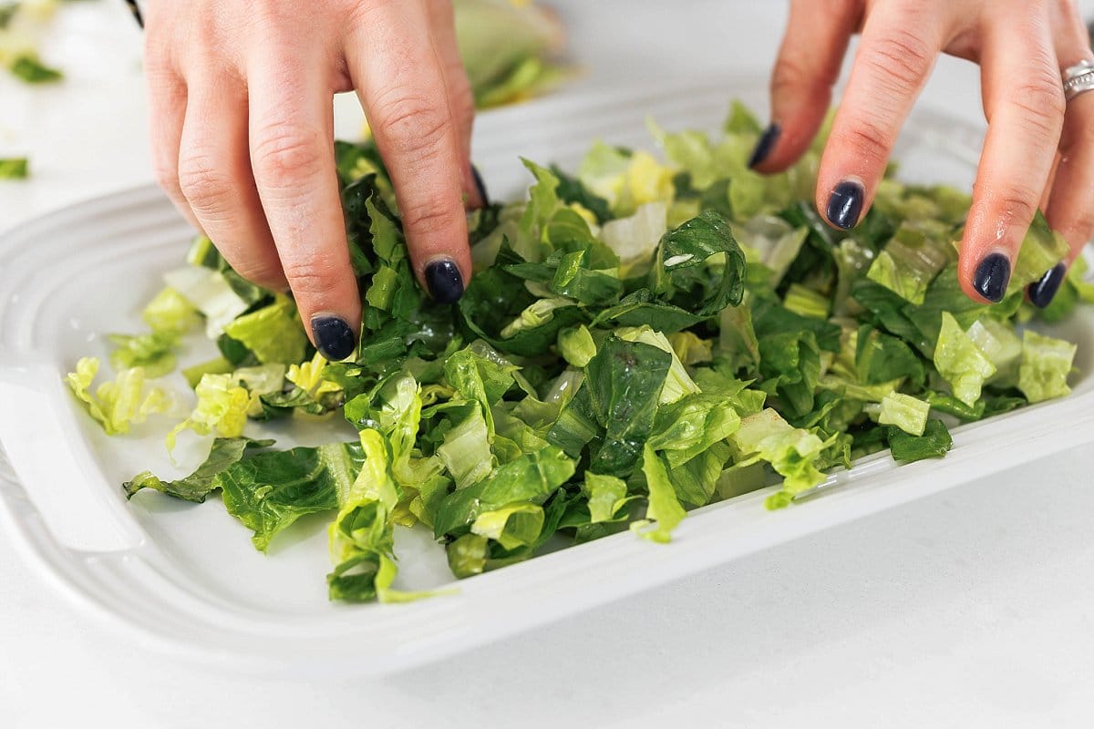 Then in a large bowl or a platter, start with your chopped romaine lettuce.